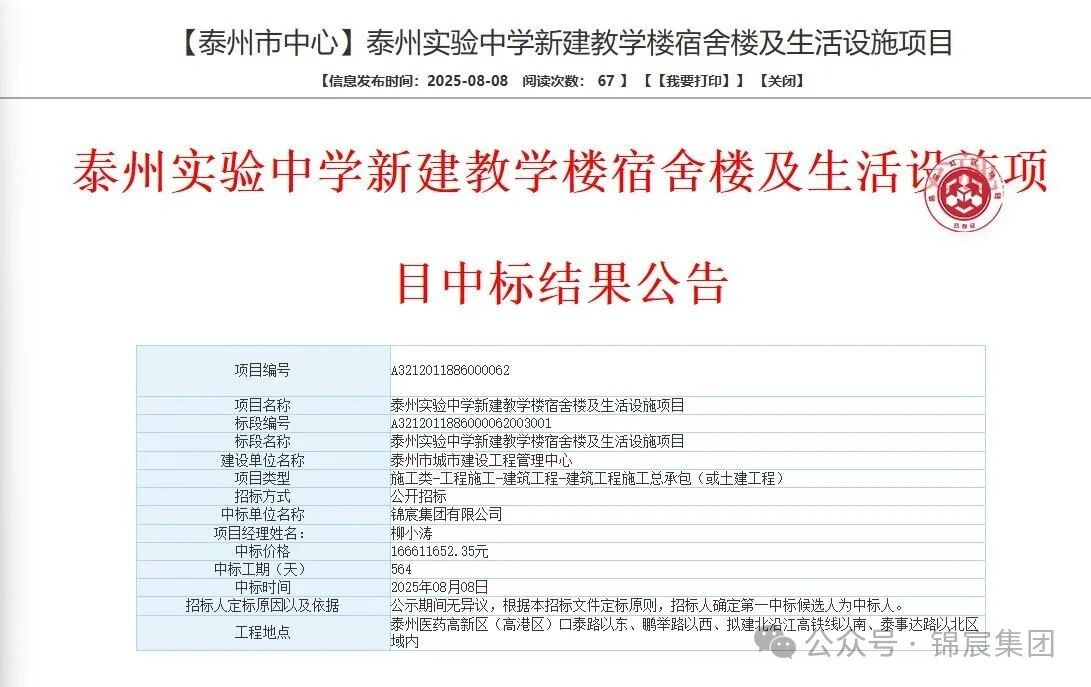 從泰州市公共資源交易中心獲悉,錦宸集團(tuán)中標(biāo)泰州實(shí)驗(yàn)中學(xué)新建教學(xué)樓宿舍樓及生活設(shè)施項(xiàng)目,這是繼張甸鎮(zhèn)村民集中居住區(qū)建設(shè)項(xiàng)目一期工程(北沿江配套)、蔣垛鎮(zhèn)果蔬深加工廠房建設(shè)項(xiàng)目(二期)后,集團(tuán)公司在一個月內(nèi)的第三次中標(biāo),中標(biāo)總額達(dá)2.56億元,為沖刺全年再發(fā)力打下堅(jiān)實(shí)基礎(chǔ)。